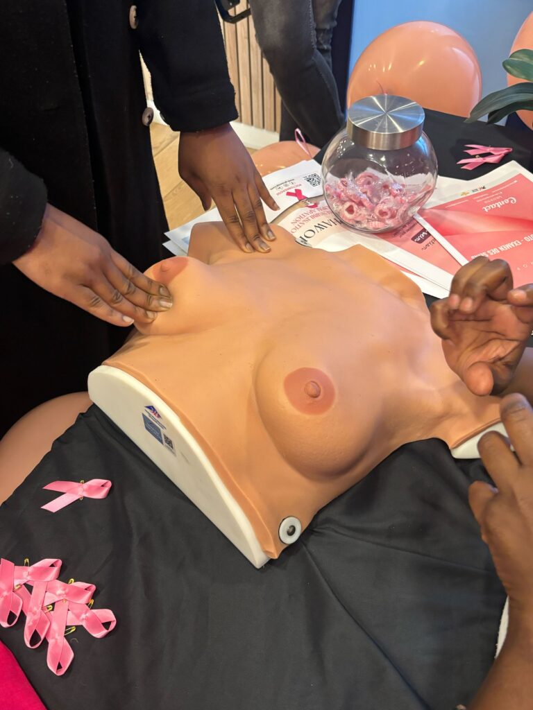Nos étudiants ont participé à des ateliers de palpation mammaire, permettant d’apprendre les gestes d’auto-examen et de mieux comprendre les signes qui doivent alerter. Des échanges ont également porté sur les bonnes pratiques de prévention, comme la consultation régulière chez un professionnel de santé et la mammographie.